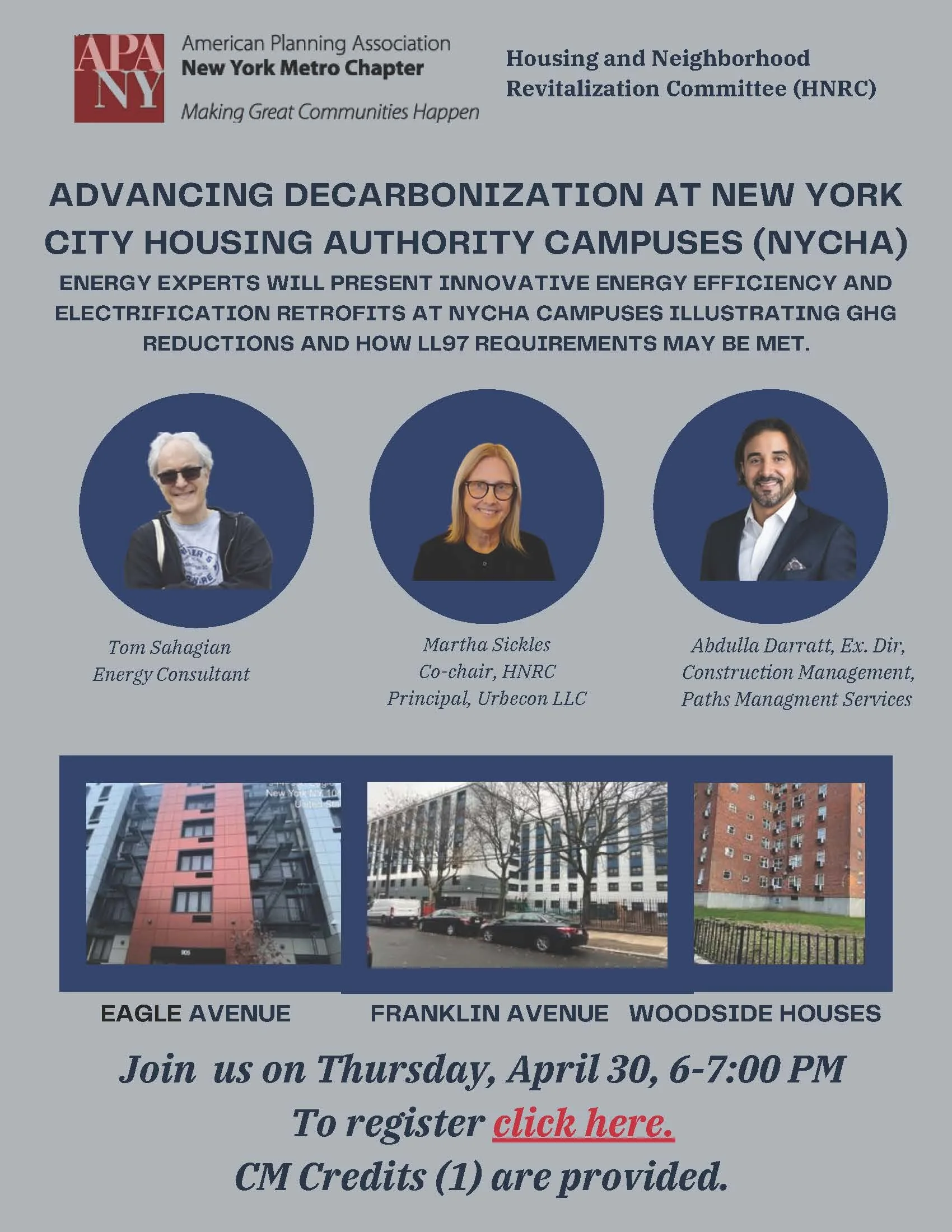 NYC Buildings are challenged by the need to comply with LL97 by reducing their carbon emissions over time. NYCHA working with building experts and supported by NYSERDA and NYPA are showing pathways to compliance. Energy experts will present innovative energy efficiency and electrification retrofits at NYCHA campuses illustrating GHG reductions and how LL97 requirements may be met.
