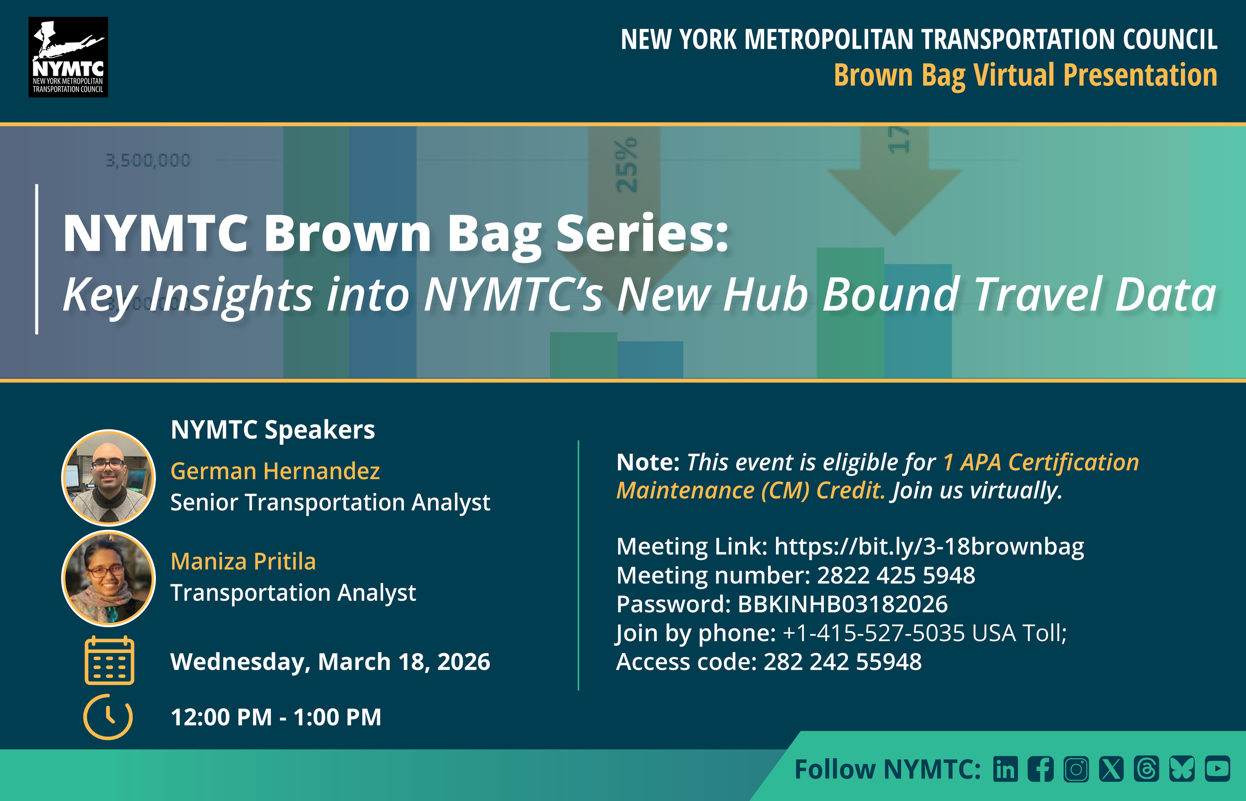 Join NYMTC technical and transportation analytics staff as they discuss the findings from the latest Hub Bound Travel Data report. This important study measures and examines the magnitude of public and private transportation modes operating to and from Manhattan’s Central Business District – the busiest area of New York City!